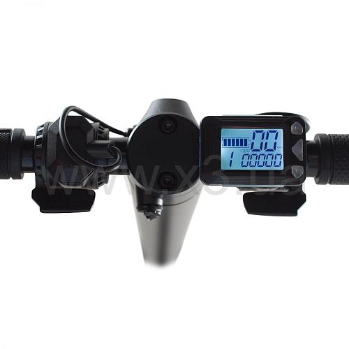 Модель имеет бортовой компьютер, расположенный на руле. На дисплее перед глазами пилота постоянно находится информация об остатке заряда аккумулятора, километраже поездки и текущей скорости. Кнопки включения и переключения передач находятся здесь же, справа от экрана. Компьютер позволяет также выставить ограничение скорости, это актуально как в целях безопасности при неблагоприятных дорожных условиях, так и для родительского контроля. Электросамокат, как и любой транспорт, имеет свои газ и тормоз, это рычаги под правой и левой рукоятками руля соответственно. Сами рукоятки сделаны из нескользящего прорезиненного материала. Дополнительный ножной тормоз скрыт под крылом заднего колеса. Для вечерних прогулок в верхней части рулевой стойки предусмотрена светодиодная фара. Кнопка включения расположена на ней же.
