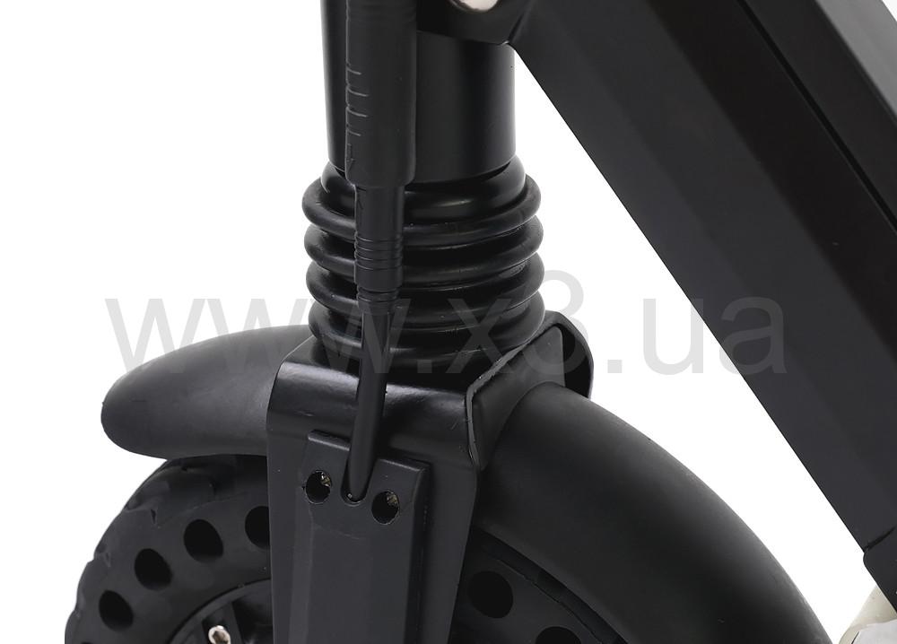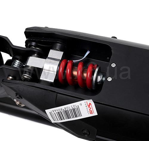 Имеется передняя и задняя системы амортизации. Благодаря чему, движение самоката очень мягкое. При значительных неровностях на дороге, ногам не передается жесткая вибрация от езды. Подвеска самоката крепкая и надежная.