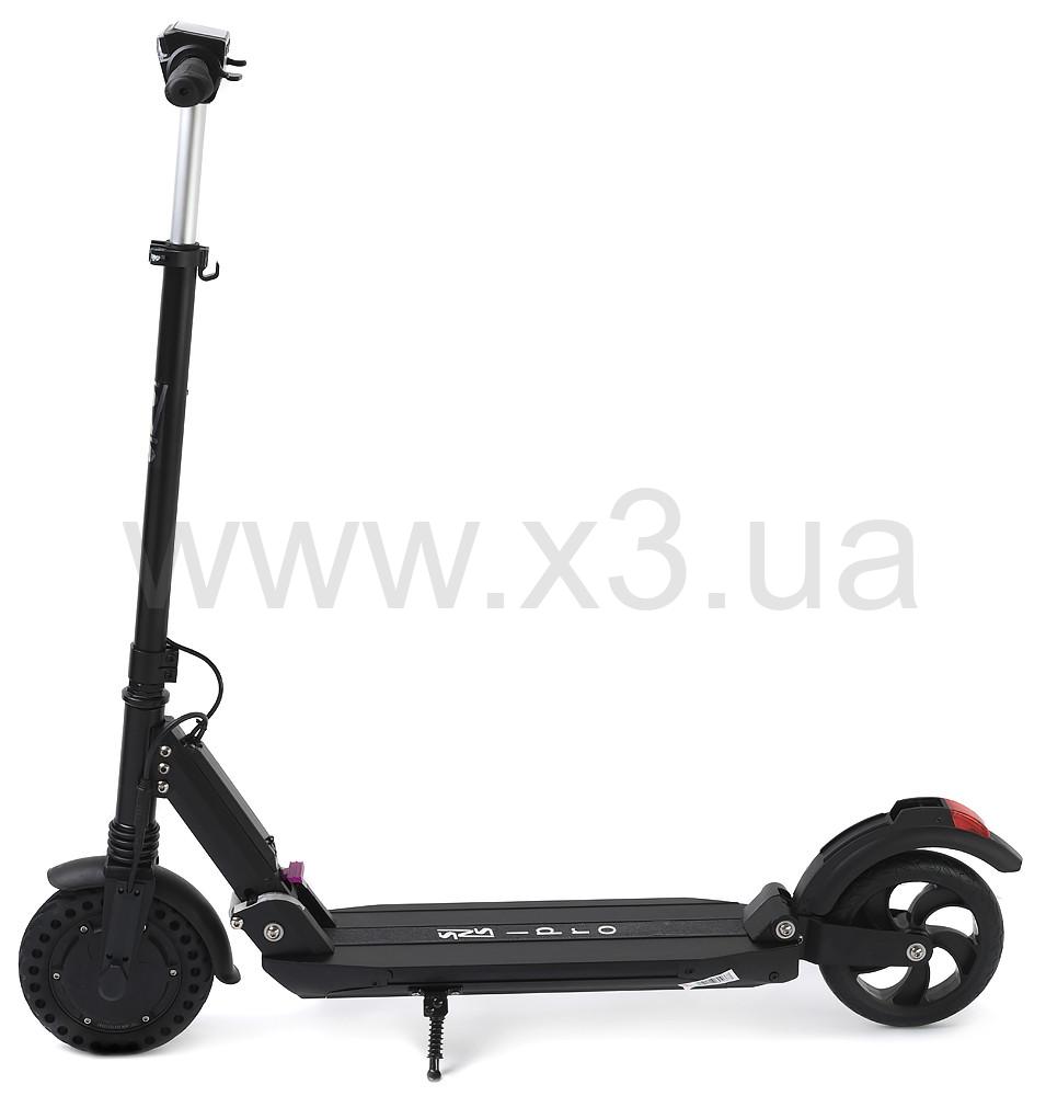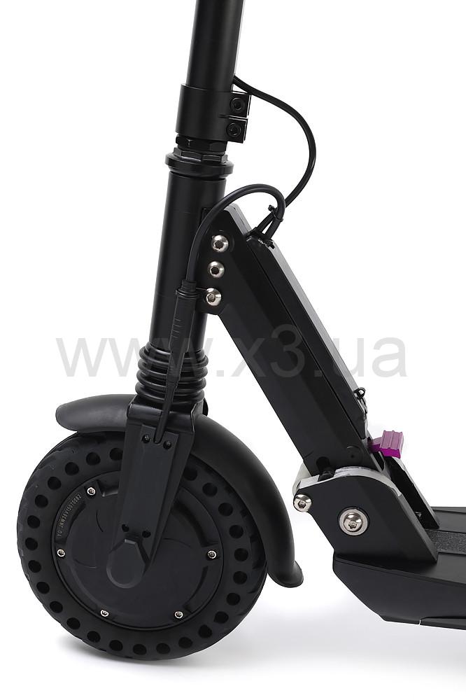 Электросамокат состоит из: Рулевой стойки, к которой подведено переднее колесо, оснащенное мотором мощностью в 350 W. Рулевая стойка регулируется по росту.