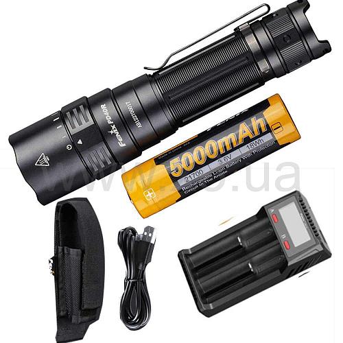 Модель фонаря Fenix PD40 V2.0, батарейка ARB-L21-5000 21700 литий-ионная, кабель для зарядки USB Type-C, ремень, чехол, запасное уплотнительное кольцо, руководство пользователя, гарантийный талон.
