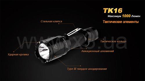 Фонарь Fenix TK16 входит в серию тактических. При помощи специальных креплений, он может быть присоединен к оружию и использоваться на охоте или во время выполнения заданий служащими спецподразделений. Помимо того, он прекрасно подойдет для использования в туристических и поисковых целях.