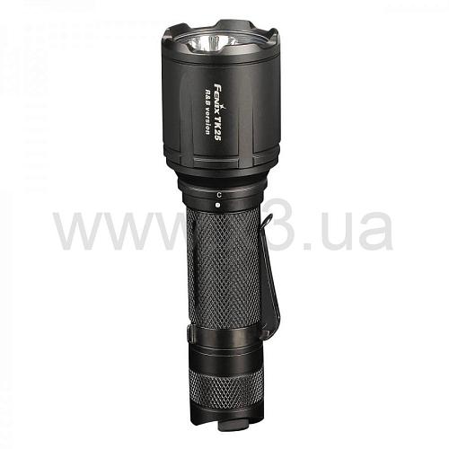 Fenix TK25RB — тактический фонарь с огромными функциональными возможностями. Он работает на базе долговечных светодиодов производства Cree: XP-G2 S3 для белого освещения и XP-E2 для синего, красного. Оба диода в состоянии светить более 50 тысяч часов каждый. Яркость белого луча достигает 1000 люмен, а радиус освещения при этом составляет 225 метров. Помимо того, белый диод также работает в трех дополнительных режимах яркости и сигнальном режиме Strobe. Цветному диоду доступно три режима работы: Red high на 150 люмен, Red low на 25 люмен, Blue на 60 люмен.