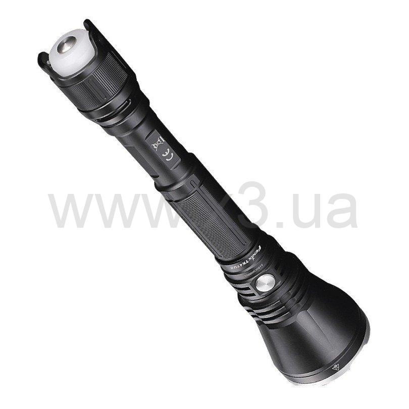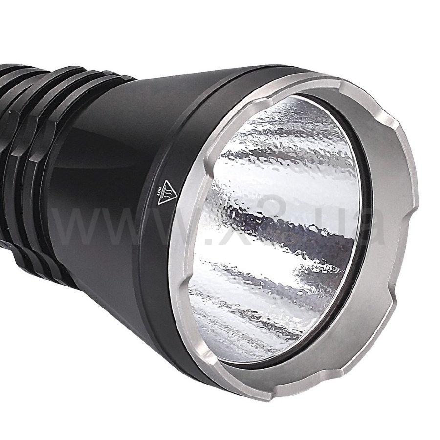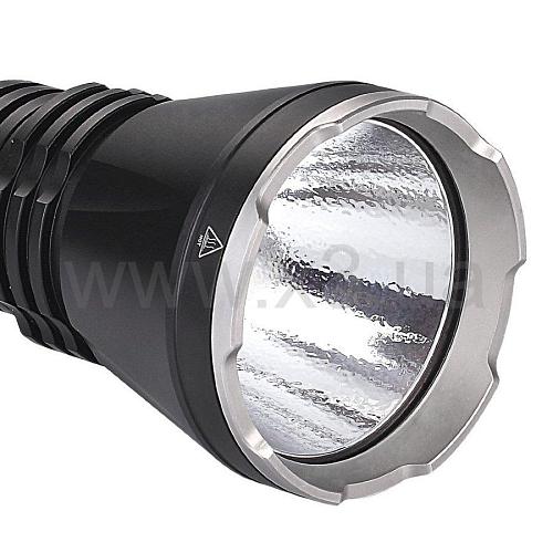 Если вам необходим сверхяркий фонарь, который в состоянии предоставить множество вариантов освещения, то модель Fenix TK47UE — именно тот вариант, который подойдет для большинства ситуаций. Его основная особенность состоит в наличии сразу двух отдельных оптических узлов. Они встроены с разных сторон корпуса: в голове и хвосте фонаря. Главный светодиод располагается в голове. Это модель Cree XHP70, которая дает яркость до 3200 люмен, сохраняя свойственную всем представителям этого бренда работоспособность — 50 тысяч часов работы. Дальность луча этого фонаря может достигать 408 метров. Диод встроен в рефлектор типа «апельсиновая корка» с неровными стенками, что также увеличивает угол центрального светового пятна до 10° и делает засветку более мягкой и равномерной. Данный диод работает в шести режимах, в числе которых один сигнальный — стробоскоп. Рабочие характеристики каждого из режимов таковы: