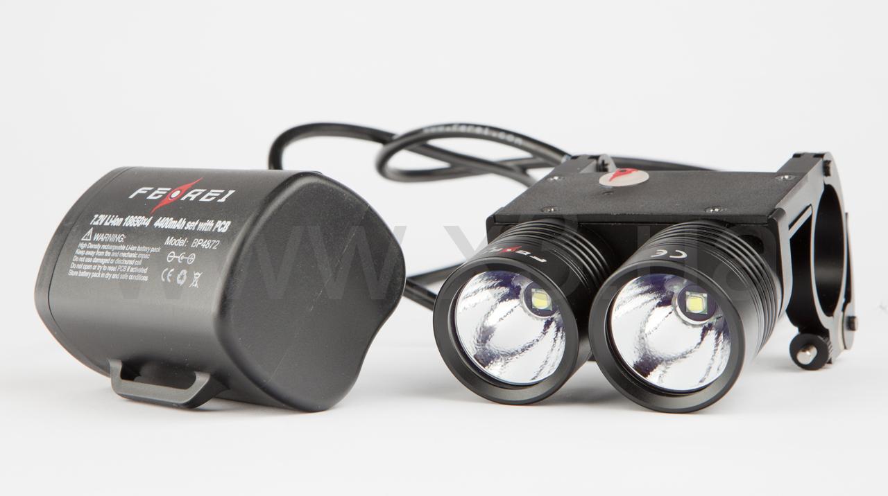 В фонаре BL200 в качестве источника света используются два сверхярких светодиода Cree XM-L T6, размещенные в отдельных корпусах. Кнопка-переключатель находится на верхней стороне корпуса в удобном, легкодоступном месте. Оптимально подобраны размещение и усилие нажатия. Электронная схема управления велофары Ferei BL200 позволяет задавать любой режим яркости и запоминает его (программируемый режим). Рядом с кнопкой расположен световой 4-х уровневый индикатор заряда батареи (100%-80%-50%-20%).