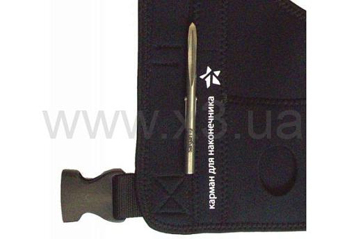 Также разработчики жилета «Бронник» позаботились и о безопасности подводного охотника, расположив на правой лицевой стороне жилета две петли из стропы 25мм для вертикального крепления любого ножа, предназначенного для подводной охоты.