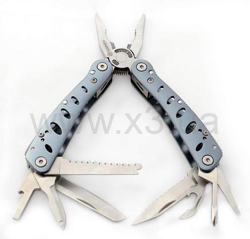 Инструменты: кусачки, плоскогубцы, маленькая отвертка плоская, крестообразная отвертка, нож, нож с зубчатым лезвием, открывалка для бутылок, консервный нож, для снятия изоляции, пила, шило, держитель бит. Кроме того, в комплекте идет 10 насадок для отверток.