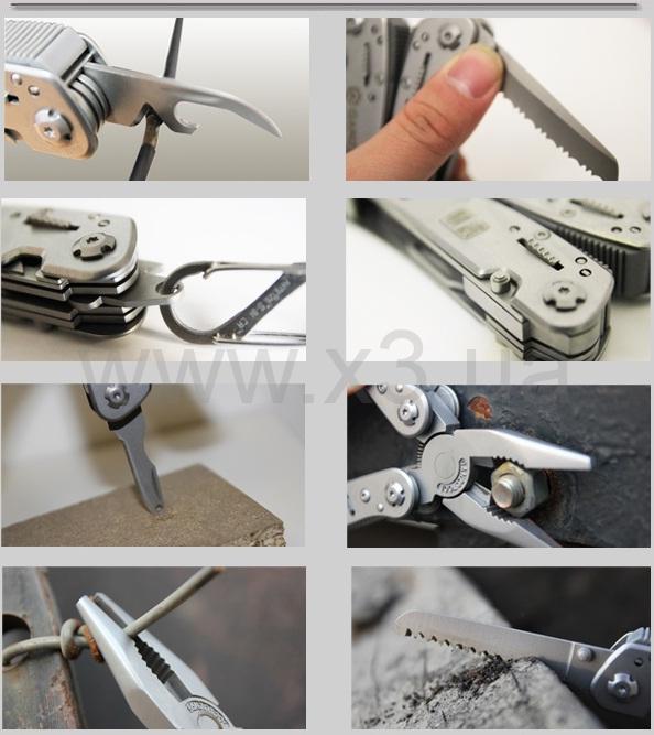 Отличительной чертой этого инструмента от своих собратьев является возможность открытия аксессуаров одной рукой и система фиксации. Лезвия исполнены из высокопрочной стали.