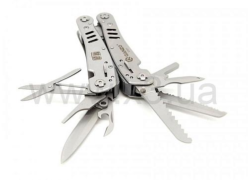 Инструменты: кусачки, плоскогубцы, маленькая отвертка плоская, нож, нож с зубчатым лезвием, пила, шило c петлей, открывалка для бутылок, консервный нож, ножницы, инструмент для снятия изоляции, держатель бит, стропорез, крепление к подсумку. Кроме того, в комплект входит 12 сменных насадок для отверток.