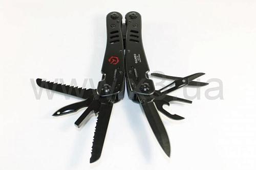 Инструменты: кусачки; плоскогубцы; маленькая плоская отвертка; стропорез; нож; нож с зубчатым лезвием; открывалка для бутылок; консервный нож; ножницы; крепление к подсумку; пила; шило c петлей; держатель для бит; инструмент для снятия изоляции. 12 отверток (сменные насадки в комплекте).