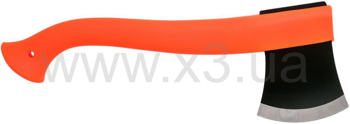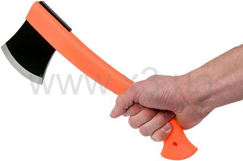 Ручка топора выполнена из полипропилена. Этот материал очень надежен и может выдержать по-настоящему серьезные нагрузки. В то же время, он не впитывает воду, не боится коррозии и защищен от многих других негативных факторов. Цвет рукоятки — ярко-оранжевый, а потому топор будет легко найти в любой природной среде.