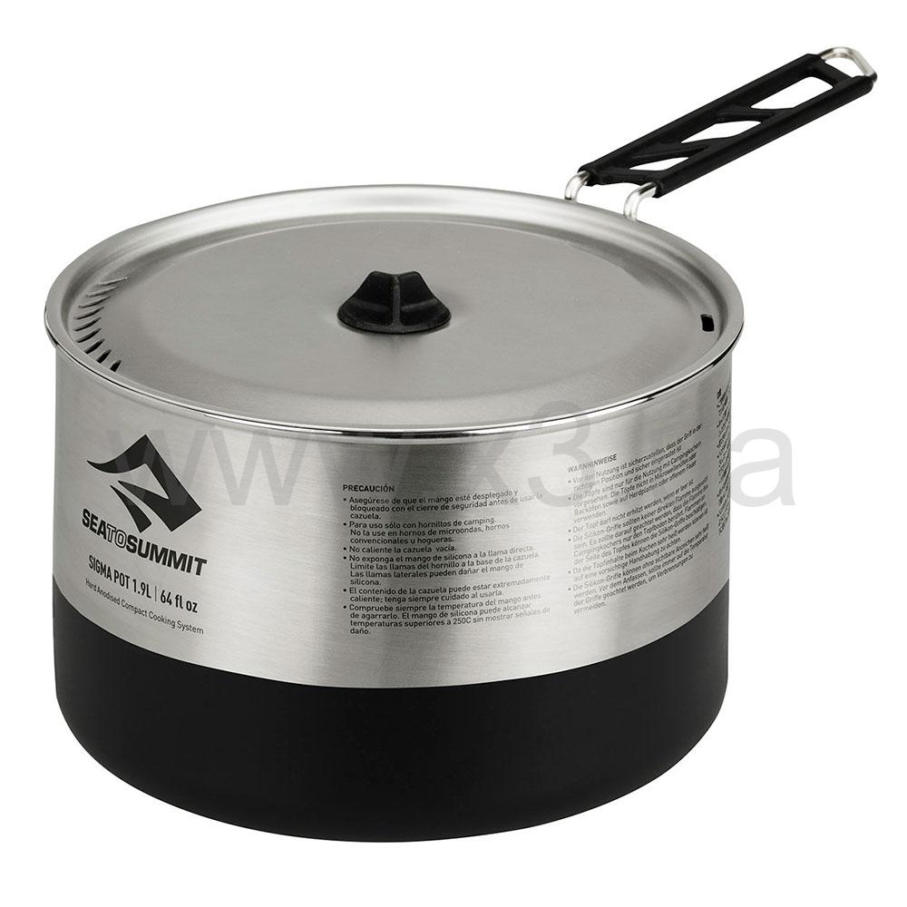 Sea to Summit Sigma Pot - крепкий котелок с крышкой, объемом 1.9л. Изготовлен из высококачественной, морской, нержавеющей стали. Очень легкий (всего 317г), прост в уходе, устойчив к истиранию и долговечен. Силиконовая ручка Pivot-Lockкрутится горизонтально и фиксируется для приготовления пищи или транспортировки. Крышка с силиконовой ручкой и с отверстиями для слива воды. Покрытие Fluxtherm отвечает за равномерное распределения тепла и быстрый нагрев. Внутри есть мерная шкала. Черное текстурированная дно - для лучшей устойчивости на газовых горелках. Котелок совместим с наборами посуды Sigma Pans, DeltaLight, AlphaPots, и AlphaPans для компактного транспортировки. Полностью безопасен для человека и окружающей среды, не содержит вредного бисфенола-А (BPA-free). Такой котелок отлично подойдет для горных походов и отдыха на природе.