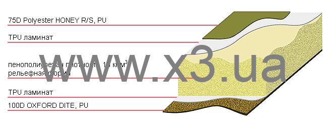 Ткань верхней поверхности POLYESTER HONEY Rip Stop - легкая полиэстеровая ткань, имеющая шестиугольный узор плетения нити по технологии Rip Stop для повышения прочности. Усиленная вплетением более прочной нити ткань дна OXFORD DITE предотвращают скольжение коврика, увеличивают срок эксплуатации.