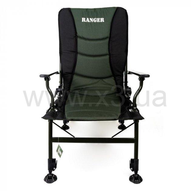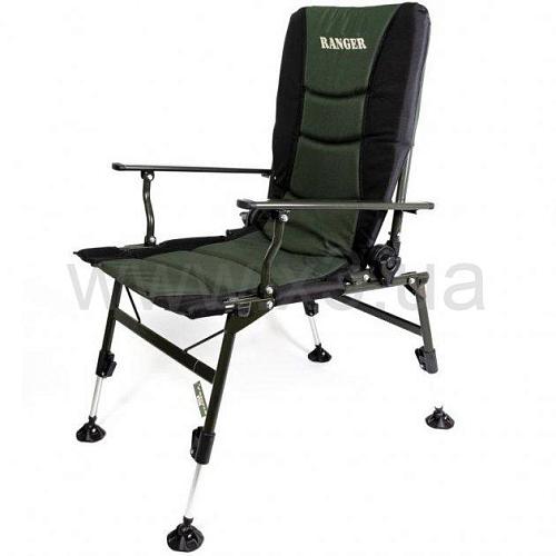 Карповое кресло Ranger Сombat SL-108 — рыбаки оценят данную модель, так как можно отрегулировать по высоте и наклону каждую ножку. На неровных поверхностях это очень актуально. Также спинку можно регулировать по желанию, опускать до положения лёжа, и использовать кресло как раскладушку, тем более, что мягкий наполнитель создаёт приятные ощущения во время отдыха. Кресло крепится болтами, что позволяет без труда повесить на подлокотниках всевозможные обвесы для рыбалки. А ещё таким же образом легко снять ткань для стирки. Нижняя часть спереди усилена дополнительными трубками, что позволяет выдерживать большие нагрузки веса людей. Каркас изготовлен из стальных трубок диаметром 19-22 мм. Пятаки на ножках — 7 см, Спинка регулируется при помощи фиксаторов-защелок, намного быстрее можете регулировать в отличии от фиксаторов- закруток. Отличное сочетание цены и комфорта. Оснащен мягкими накладками на трубы каркаса. Кресло выполнено в строгом темно зеленом цвете и подголовником черного цвета, внутри мягкий наполнитель. Кресло можно использовать для отдыха на природе, на даче и во дворе. Компактно складывается для хранения и транспортировки.