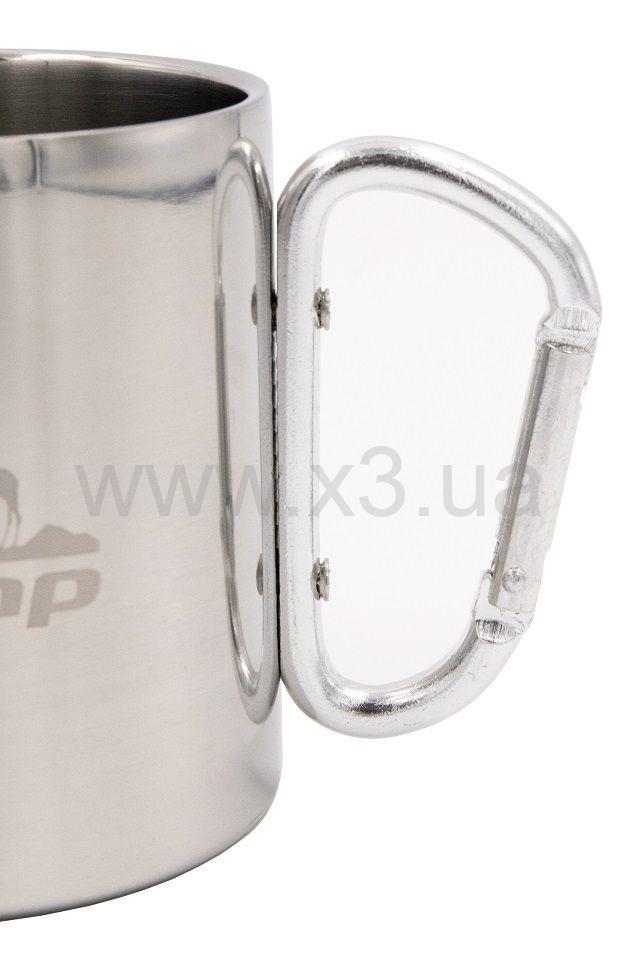 Туристическая термокружка с ручкой-карабином на 350 мл легко пристегивается за карабин к поясу или к лямке на рюкзаке — никогда не потеряется.