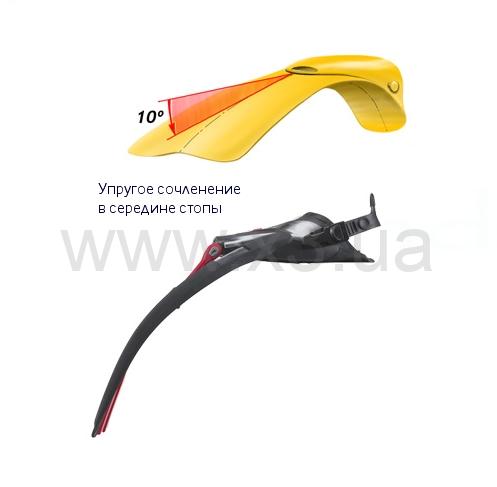 Лопасть присоединена к галоше упругими боковыми сочленениями в двух точках в середине стопы. Это позволяет пальцам ног и стопе находиться в более естественном, комфортном положении. Это также позволяет лопасти достичь более широкого диапазона своего движения. Результат – импульс большей силы, больше комфорта, энергии и эффективности.