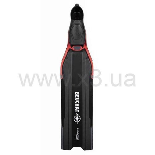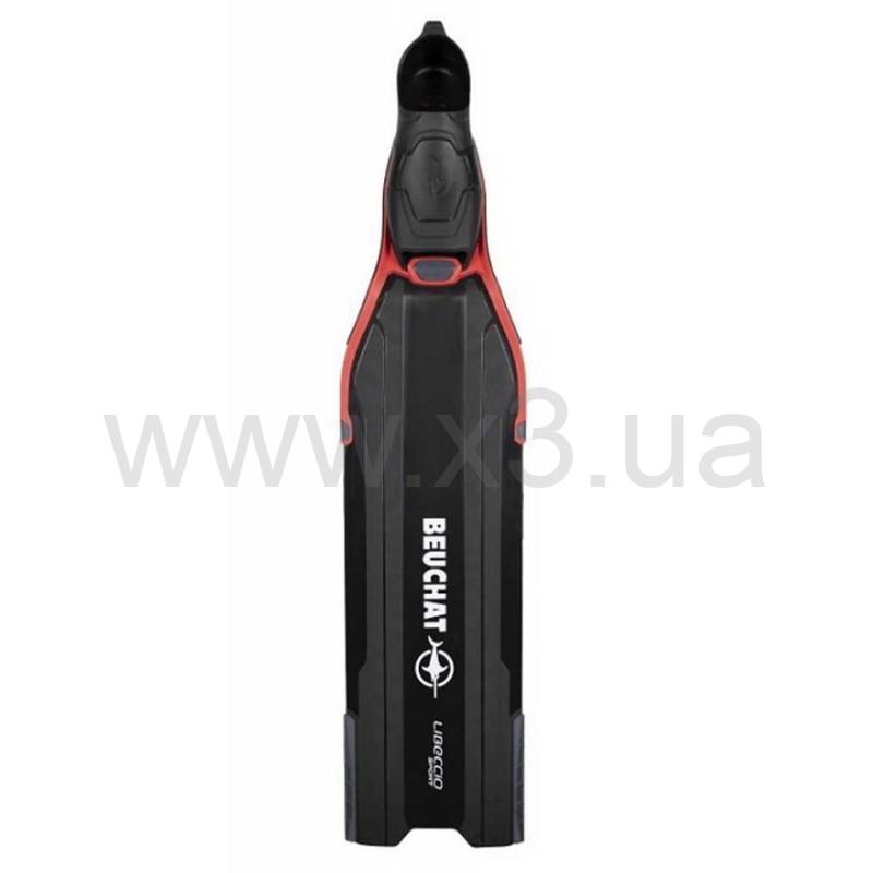Ласты Beuchat LIBECCIO средней жёсткости. Отличительная черта этой модели - лопасть черного цвета с дополнительными элементами красного цвета. Композитные ласты закрытого типа с удлинённой лопастью, что увеличивает эффективную площадь гребка по сравнению с традиционными моделями. Благодаря “слому лопасти” обеспечивается оптимальный угол наклона ласты к плоскости стопы, в результате чего намного снижается нагрузки на мышцы стопы и голени. Ласты обеспечивают взрывные скорости при старте с места, а также дают возможность поддерживать их длительное время при работе всей площади лопасти. Галоша выполнена из резины, имеющей большую эластичность, и имеет отверстие в носовой части для свободного удаления песка. Язычок на пятке упрощает процесс одевания ласты и предохраняет её от возможных прорывов галоши.
