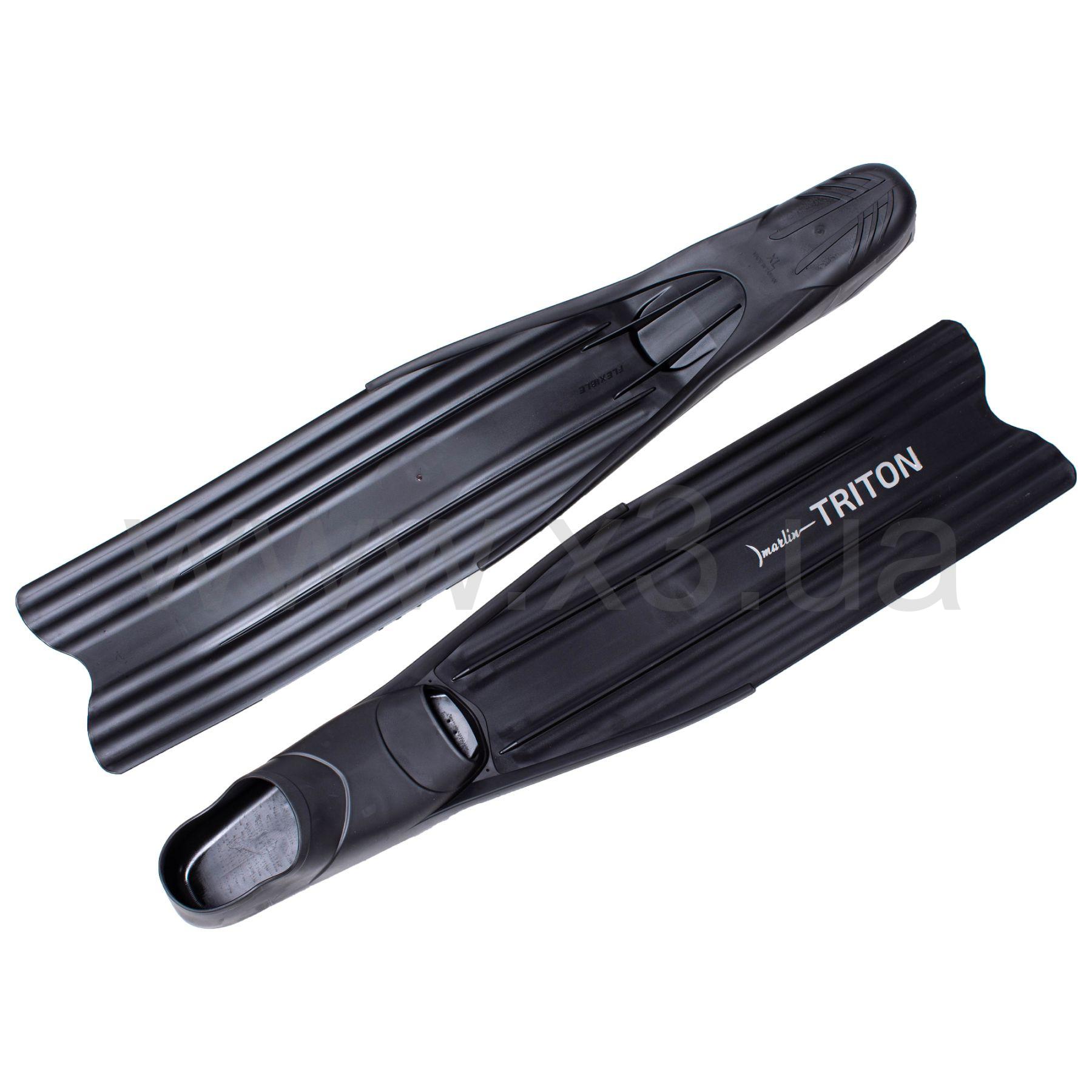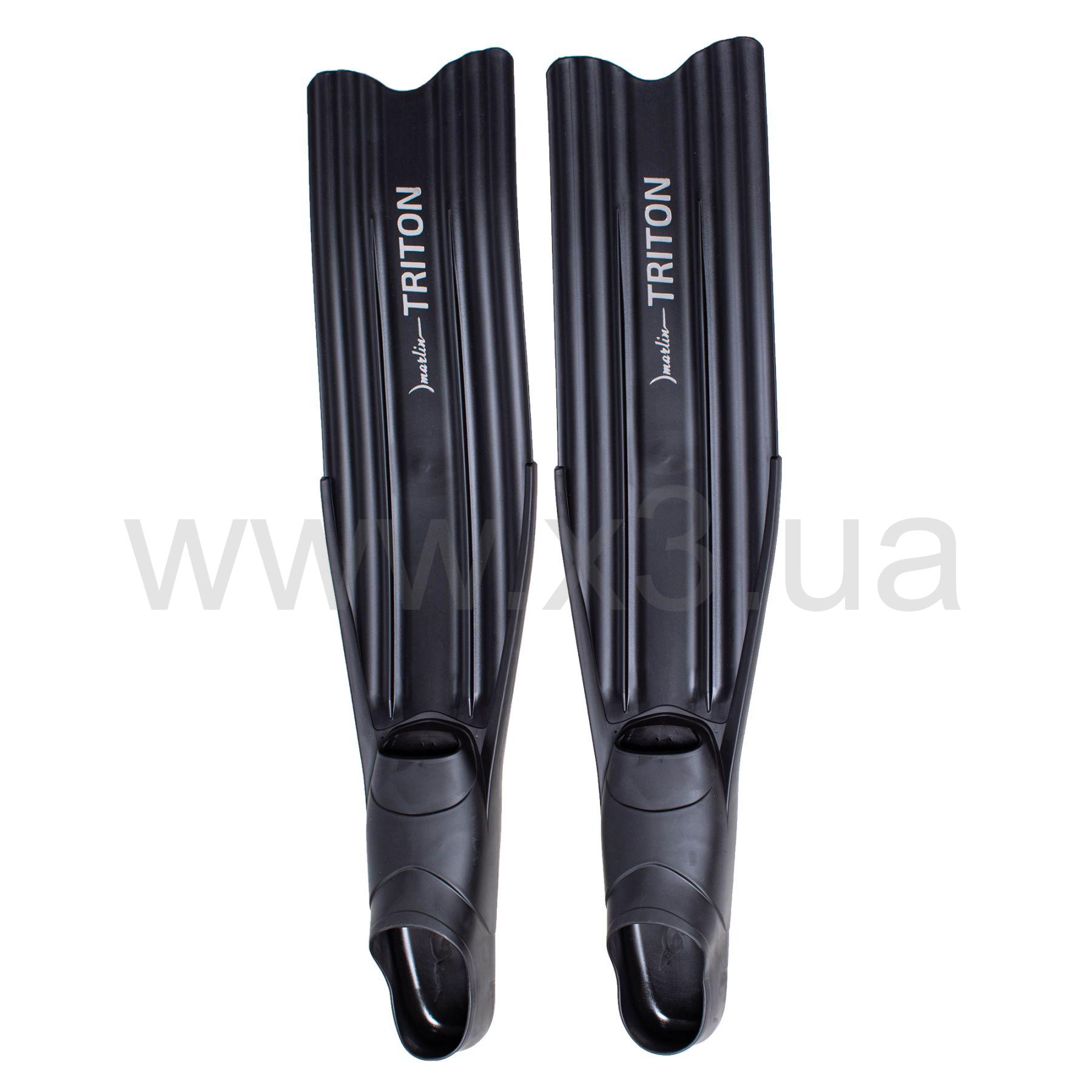 Ласты Marlin Triton (Марлин Тритон) – легкие ласты для подводной охоты и фридайвинга. Фиксированная лопасть изготовлена из полипропилена, имеет среднюю жесткость. Удобная калоша изготовлена из термопластичной резины с разной степенью жесткости. Жесткая подошва увеличивает передаваемую энергию, мягкий верх обладает хорошей эластичностью обеспечивает удобство одевания и комфорт при длительном использовании. Благодаря слому лопасти в 17 градусов, обеспечивается оптимальный угол наклона ласты к плоскости стопы, в результате чего снижается нагрузки на мышцы стопы и голени. Расположенные по всей длине лопасти направляющие потока предотвращают занос лопасти на бок.