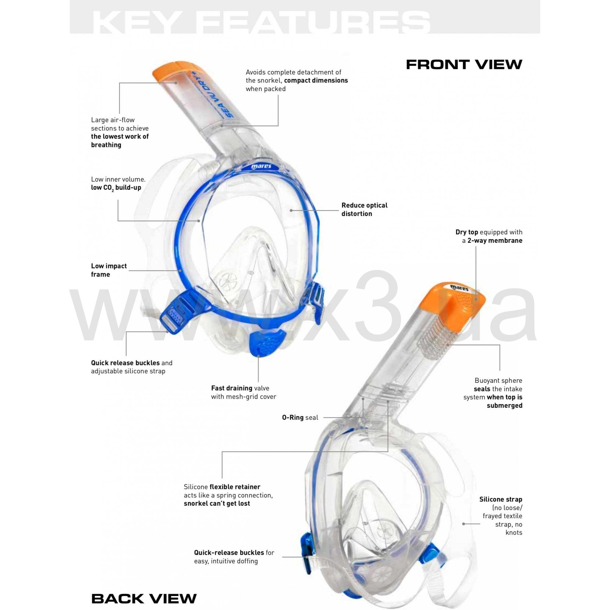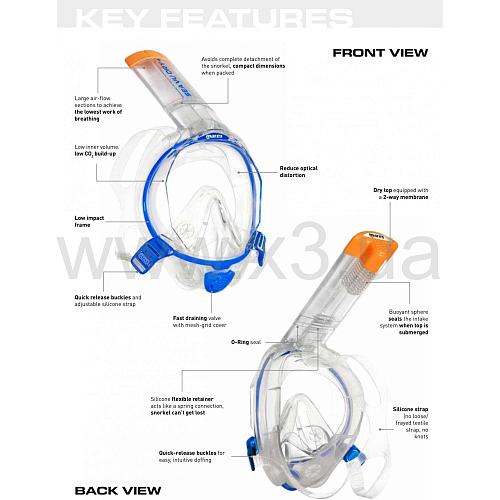 Идеальное решение для тех, кому не по душе традиционные маски и трубка! Эта инновационная полнолицевая маска и комбинированная трубка позволяют дышать естественным образом через нос и рот и покрывают все лицо, сохраняя его сухим. Такая конструкция полностью исключает запотевание маски, поэтому подводный мир под вами всегда хорошо виден.