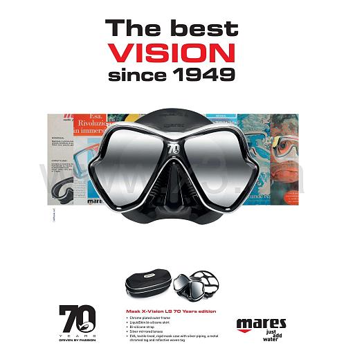 Маска Mares X-VISION LS 70 Years имеет уникальный революционный дизайн и сочетает в себе инновационные технические решения для повышения комфорта. Также используется специальная технология Liquidskin, силикон, который на 45% мягче и на 270% эластичнее обычного силикона. Маска X-VISION LS 70YEARS EDITION имеет зеркальное покрытие линзы и хромированую рамку. Дизайн маски X-VISION LS получил награду Reddot Design Award!
