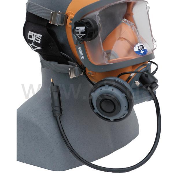 На лицевой стороне маски имеется отсек для размещения микрофонной гарнитуры. Размещение микрофона прямо напротив рта в сочетании с минимальным воздушным объемом внутренней полумаски обеспечивает хорошую разборчивость речи водолаза. Крепление телефонов осуществляется, как правило, к ремням наголовника.
