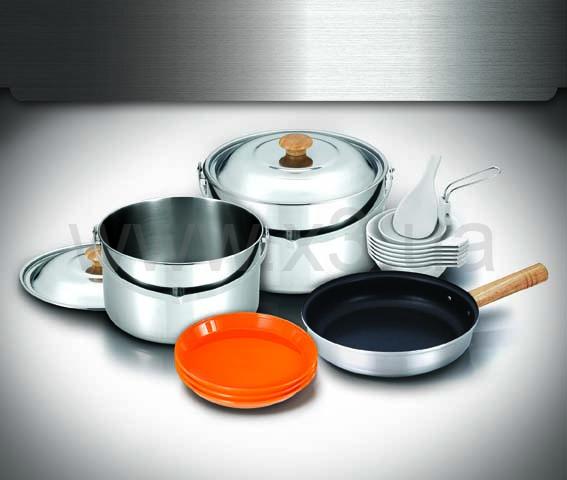 Комплектация: 2 кастрюли 6,2/4,2 л., с крышками; сковорода со съемной деревянной ручкой и антипригарным покрытием; 3 пластиковые тарелки; 5 пиал; складной половник; лопатка; нейлоновый чехол на молнии с ручками