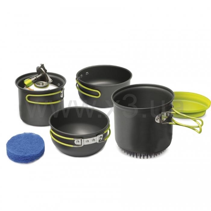 Вся посуда из этого набора изготовлена из качественного анодированного алюминия. Одна из кастрюль оснащена специальным теплообменным элементом, экономящим до 30% горючего.