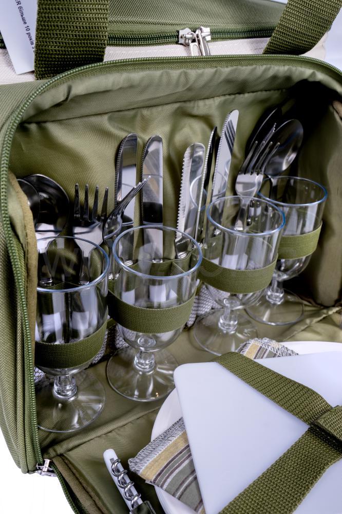 Набор посуды для 4-х человек. Пикниковый набор на 4 персоны с изотермическим отделом на 20 литров В набор входит: 4 тарелки, 4 бокалов (пластик), 4 ложки, 4 вилки,4 ножа, 1 хлебный нож,открывашка,контейнер для соли и перца дощечка для нарезки, салфетки. Сумка удобна для хранения скоропортящихся продуктов или напитков.Все сделано из высококачественного пластика. В данной сумке присутствует большой отсек для хранения еды и напитков, что значительно облегчит их транспортировку.