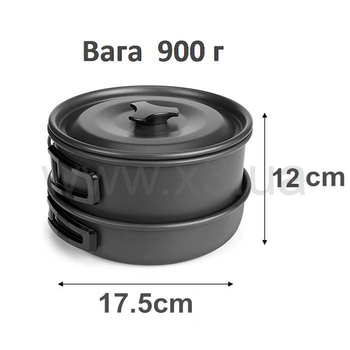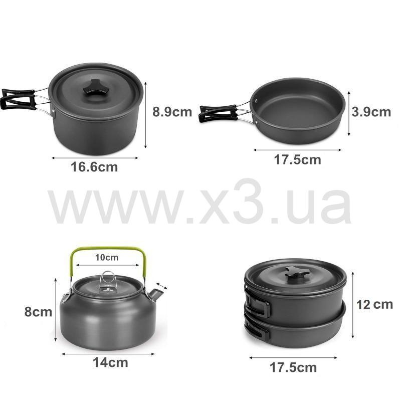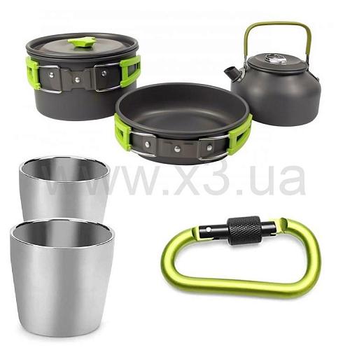В комплект посуды входит: котел с крышкой – 1 шт; сковорода – 1 шт; чайник – 1 шт; бокалы – 2 шт; кровати – 1 шт; вилка – 1 шт; нож – 1 шт; карабин, чехол для хранения.