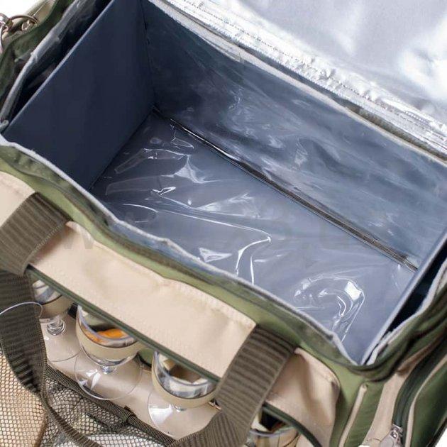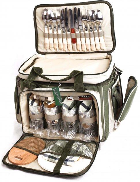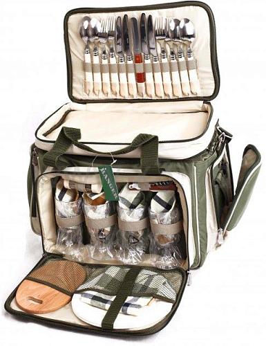 Сумка-набор посуды для 4-х человек. Набор состоит из 4 тарелок, 4 бокалов (пластик), 4 ложек, 4 вилок, 4 ножей, 1 хлебного ножа, досточки для нарезки, салфетки. Сумка подходит для хранения скоропортящихся продуктов. Набор для людей, которые ценят комфорт и качество отдыха.