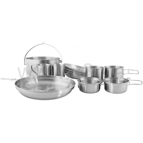 Набор посуды из нержавеющей стали идеально подходит для кемпинга. Он содержит четыре тарелки, 2 кружки со складными ручками и глубокими крышками, которые также можно использовать в качестве мисок, две кружки с ручками и большая кастрюля емкостью 4 литра. Крышка также может быть использована в качестве кастрюли.