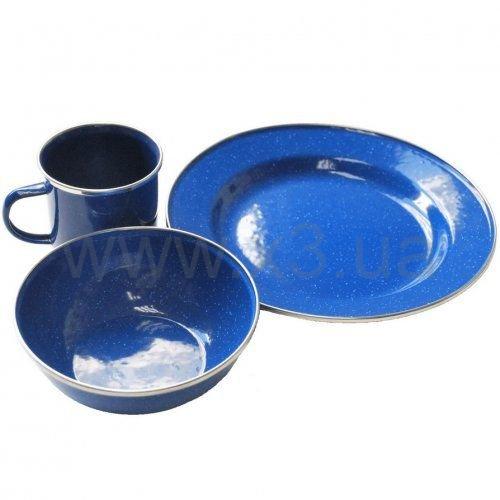 Набор прочной и долговечной посуды из эмалированной стали для туризма и кемпинга на одну персону.