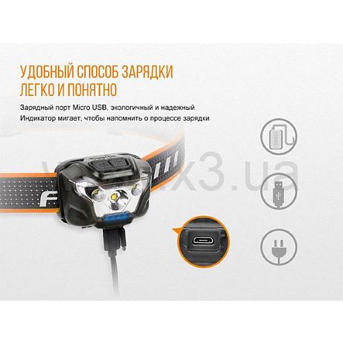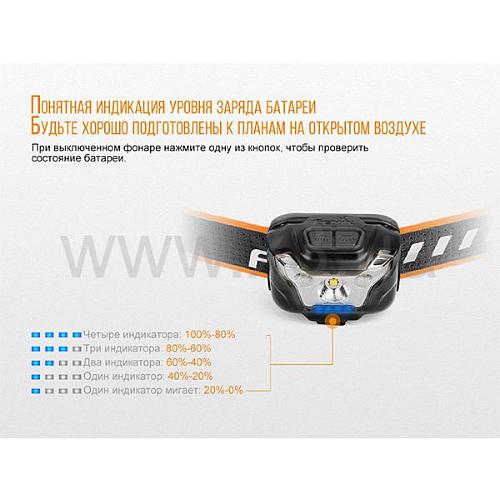 Аккумуляторы для фонаря Fenix HL18R можно заряжать непосредственно внутри батарейного отсека, подключив power-банк через кабель USB. Этот кабель есть в комплекте с фонарем. О том, когда потребуется зарядка, пользователь узнает благодаря интегрированному индикатору. Он включается каждый раз при включении фонаря, а также по желанию владельца – во время использования Fenix HL18R.