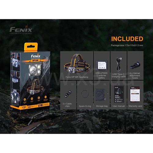Налобный фонарь Fenix HP16R является перезаряжаемой высокопроизводительной моделью. Он обеспечивает пользователю яркость в 1700 люменов, а дальнобойность достигает 260 метров. Фонарь может работать в течение 300 часов в Минимальном режиме. Есть отдельный батарейный отсек, питание происходит от литий-полимерного аккумулятора Fenix ARB-LP3000. Также элементами питания могут быть четыре батареи Ni-MH/щелочные типа AA. Заряжать батареи нельзя. Аккумулятор заряжается через порт USB Type-C в батарейном отсеке. Чтобы полностью зарядить эту модель, потребуется 3 часа времени.