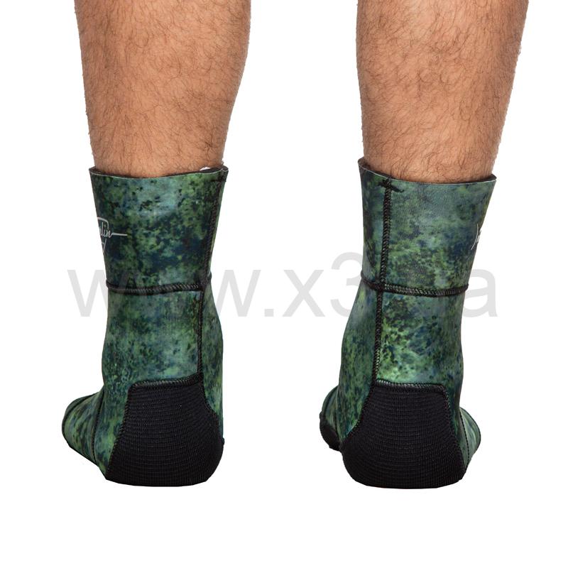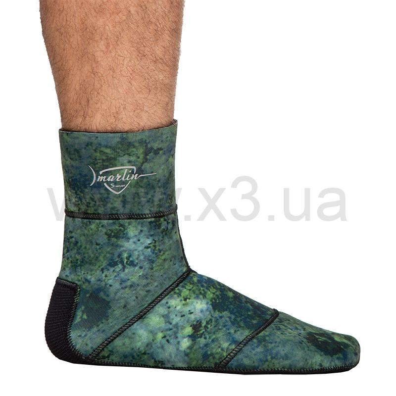 Носки Marlin Standart (Марлин Стандарт) выполнены из эластичного неопрена, имеют анатомический крой (правый, левый). Внутри - открытая пора. В камуфлированных моделях наружное покрытие лайкра, в модели черного цвета классический черный нейлон. Подошва для лучшей износостойкости выполнена из более жёсткого компрессионного неопрена и усилена материалом дюратекс. Швы проклеены специализированным неопреновым клеем.