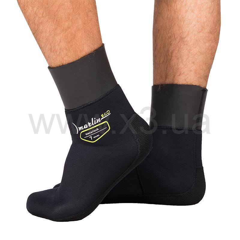 Носки Marlin WaterLock Eco Sandwich (Марлин Ватерлок Эко сэндвич) выполнены из эластичного неопрена фирмы Sheico L, имеют анатомический крой (правый, левый). Внутри – открытая пора, наружное покрытие – нейлон; верхняя часть носка выполнена из материала smoothskin sandwich. Подошва для лучшей износостойкости выполнена из более жёсткого компрессионного неопрена и усилена материалом дюратекс. Швы проклеены специализированным неопреновым клеем. Благодаря сэндвич-технологии верхняя часть носка из smoothskin неопрена надежно пришивается к нейлону основного носка. Таким образом, мы получаем инновационный носок с уникальными характеристиками, сочетающий в себе все преимущества носка с обтюрацией из smoothskin неопрена и носка с открытой порой внутри, а именно: