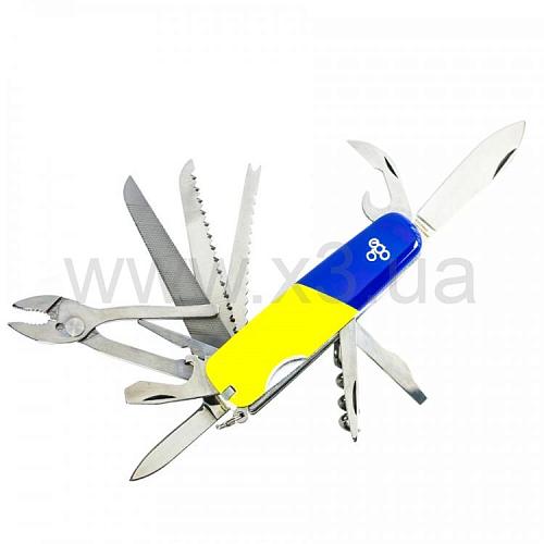 Дополнительные функции: большой клинок, малый клинок, пила по дереву, напильник, открывалка (плоская отвертка, снятие изоляции), консервный нож, стамеска, плоскогубцы (кусачки), лезвие для чистки рыбы, линейка (извлечение рыболовных крючков), шило, штопор, пинцет, зубочистка, игла