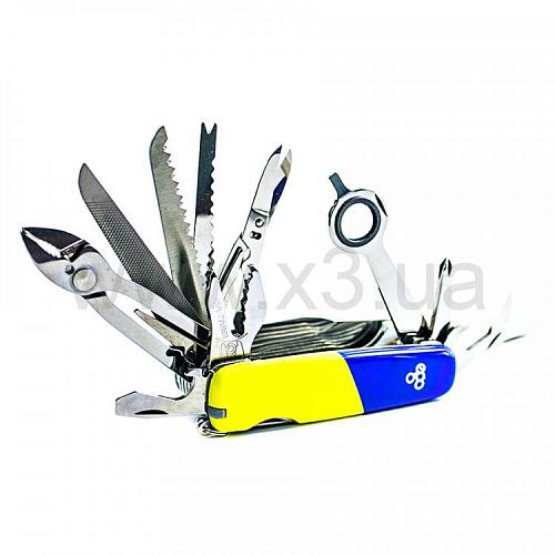 Дополнительные функции: большой клинок, малый клинок, пила по дереву, напильник, консервный нож, открывалка, ножницы, плоскогубцы, кусачки, лезвие для чистки рыбы, лупа, крестовая отвёртка, тонкая отвёртка, шило, штопор, крючок, пинцет, зубочистка, игла