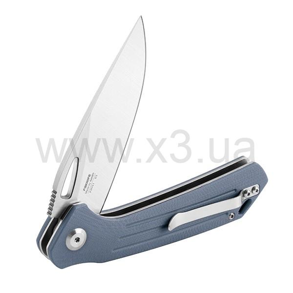 Ручка ножа изготовлена из материала G10. Стеклотекстолит, имеет устойчивость к разного рода внешним воздействиям. Неплохо поддаётся окрашиванию, защищён от ударов, воздействия высоких температур, от влаги. Простой в уходе материал, делает рукоять шероховатой на ощупь. Что способствует хорошему сцеплению с ладонью и удобству применения. Нож не будет смещаться и не выскользнет из руки, даже если она мокрая.