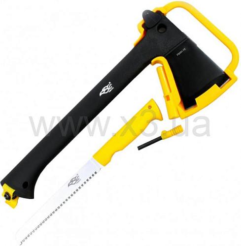 Модель FSA01-YE на самом деле представляет собою не просто топор, а целый комплект различных инструментов. В наборе имеется также пила и огниво, так что имея его под рукою, вы точно сможете заготовить дрова нужного размера и разжечь огонь.