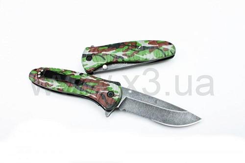 Рукоятка выполнена из ударопрочного и стойкого к воздействию многих химических веществ пластика под названием ABS. Ее поверхность неровная, для лучшего захвата ножа. Цвет рукоятки — синий камуфляж.