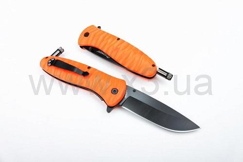 Рукоятка этой модели сделана из оранжевого рифленого пластика ABS, а клинок — вороненый.
