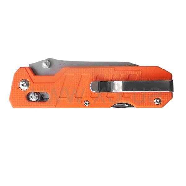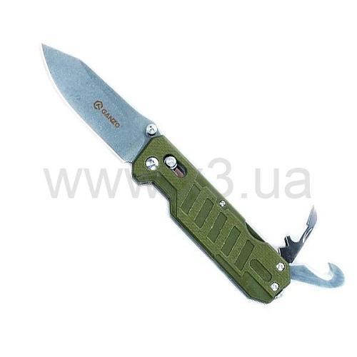 Рукоятка ножа Ganzo G735 изготовлена из популярного ныне материала — G10. Это композитный стеклопластик, который отличается простотой формовки и высокой прочностью. G10 хорошо противостоит воздействию коррозийных факторов, выдерживает большие механические нагрузки, а рукоятка из него имеет привлекательный внешний вид. Покупателям доступны варианты модели Ganzo G735 с черной, зеленой, оранжевой или оригинальной желто-черной рукояткой. С одной из сторон ручки ножа размещена металлическая клипса для закрепления на кармане. Помимо того, с обратного клинку конца рукоятки расположены дополнительные инструменты этого многофункционального складного ножа. Это стеклобой, а также складные открывалка для бутылок с приспособлением для зачистки провода и инструмент для перерезания ремней, веревок и строп. Благодаря наличию этих инструментов, нож Ganzo G735 подходит как для обычных туристических целей, так и для аварийно-спасательных работ.