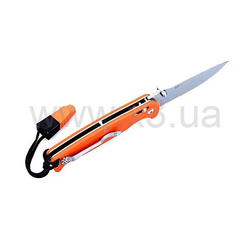 Его поверхность обработана по методу Stone Wash, из-за чего на ней видны следы от шлифовочных материалов. Этот тип обработки делает ножи почти не бликующими, а также на них гораздо меньше заметны небольшие царапины. Режущая кромка же заточена полностью гладко, чтобы нож ровно и легко резал практически любые материалы. Полная длина клинка от острия до обуха - 89 мм. Лезвие довольно прочное и по обуху его толщина равна 3,3 мм. Остальная часть из длины ножика 205 мм приходится на рукоятку. Она сделана из пластика G10, который сейчас является одним из наиболее популярных для этой детали материалов. Поверхность рукоятки ровная, но для того, чтобы она не скользила в руках, на пластик нанесен мелкий фактурный узор. Покупатели могут выбрать нож G7412 одного из трех цветов: черный, темно-зеленый или ярко-оранжевый. К каждой рукоятке уже присоединен темляк, на другом конце которого имеется небольшой свисток. Этот аксессуар вполне способен вам помочь, если во время отдыха на природе потребуется подать звуковой сигнал отдельным участникам группы.