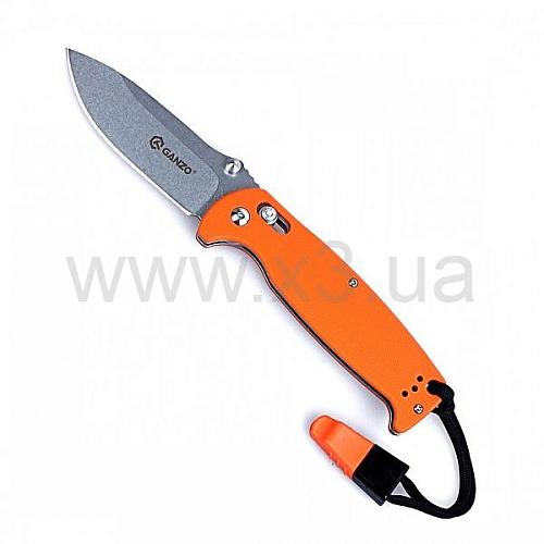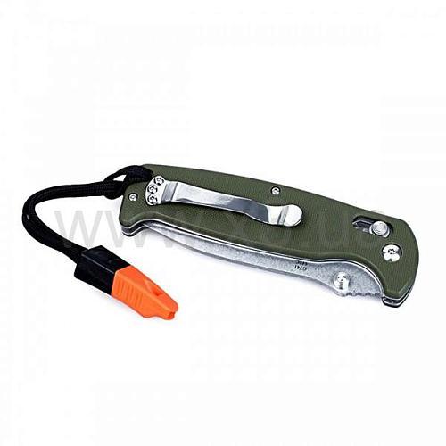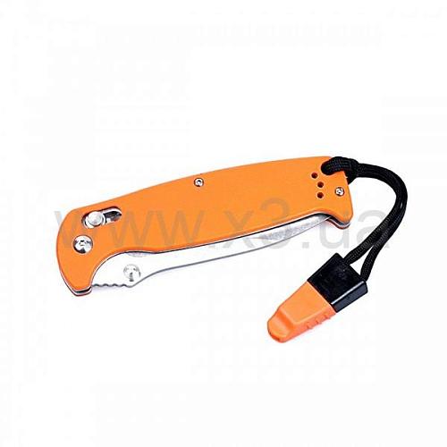 Его поверхность обработана по методу Stone Wash, из-за чего на ней видны следы от шлифовочных материалов. Этот тип обработки делает ножи почти не бликующими, а также на них гораздо меньше заметны небольшие царапины. Режущая кромка же заточена полностью гладко, чтобы нож ровно и легко резал практически любые материалы. Полная длина клинка от острия до обуха - 89 мм. Лезвие довольно прочное и по обуху его толщина равна 3,3 мм. Остальная часть из длины ножика 205 мм приходится на рукоятку. Она сделана из пластика G10, который сейчас является одним из наиболее популярных для этой детали материалов. Поверхность рукоятки ровная, но для того, чтобы она не скользила в руках, на пластик нанесен мелкий фактурный узор. Покупатели могут выбрать нож G7412 одного из трех цветов: черный, темно-зеленый или ярко-оранжевый. К каждой рукоятке уже присоединен темляк, на другом конце которого имеется небольшой свисток. Этот аксессуар вполне способен вам помочь, если во время отдыха на природе потребуется подать звуковой сигнал отдельным участникам группы.