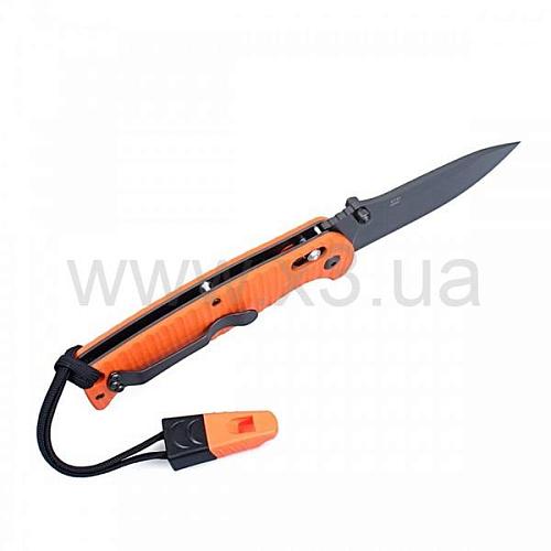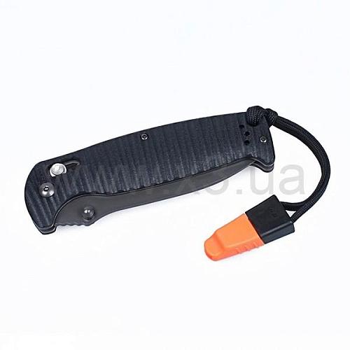 Рукоятка ножа оранжевого или же черного цвета изготавливается из стеклопластика. Такой материал позволяет сделать нож, в целом, более легким, но обеспечивает ему достаточный запас прочности и долговечности, чтобы Ganzo G7413Р можно было свободно использовать на рыбалке, в походе или для выполнения разнообразных задач в городе. Кстати, для использования ножа в туристических целях, очень удобно, что эта модель продается сразу с темляком и свистком.