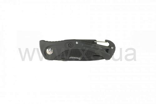 Длина клинка в походном положении: 114 мм. На рукоятке есть спасательный свисток для подачи сигнала бедствия и карабин, благодаря которому нож можно пристегнуть к рюкзаку или поясу.