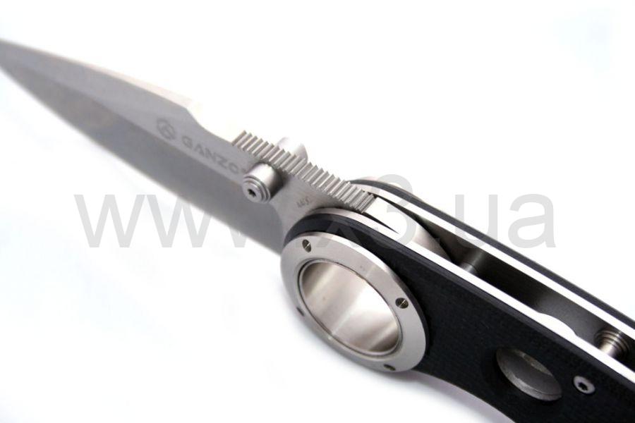 Ganzo G708 — компкатный нож с отверстием в виде кольца между рукояткой и клинком. Продев палец в кольцо, нож удобно удерживать в руке во время работы. На клинке есть шпенек, с помощью которого можно открыть лезвие одной рукой.