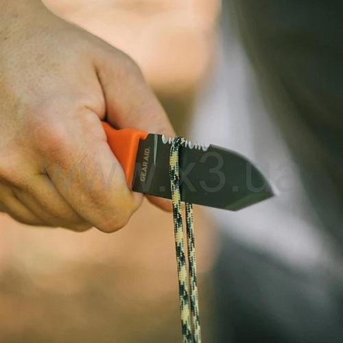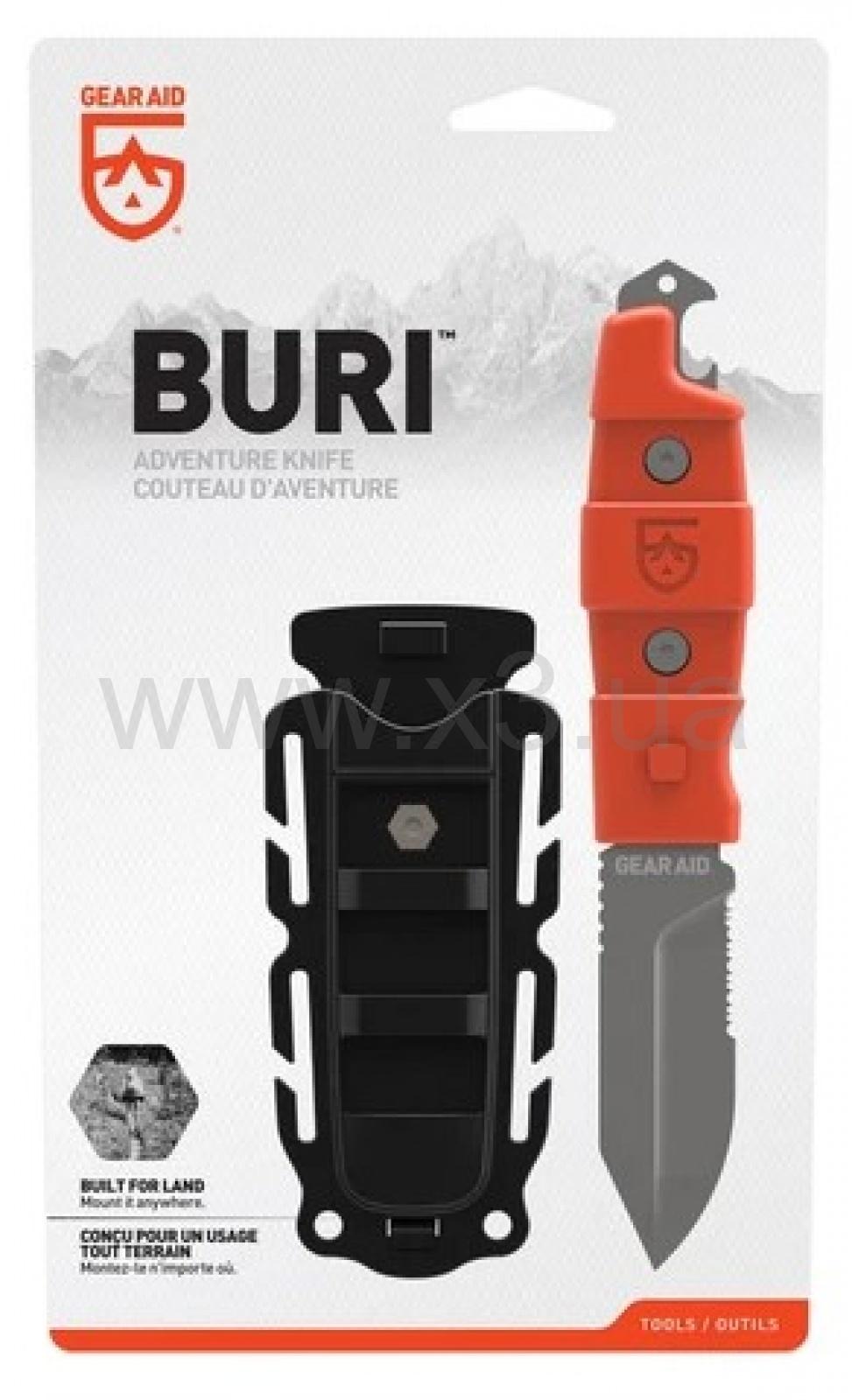 Нож с ножнами Gear Aid Buri Utility характеризуется производителем как утилитарный инструмент для использования в полевых условиях. Полнохвостовой клинок выполнен с использованием коррозиестойкой стали марки 420, которая с внешней стороны обработана износоустойчивым титановым покрытием. Твёрдость используемой стали не уточняется, но обычно она не превышает 52-56 единиц по шкале HRC. Для создания цельной рукоятки и универсальных ножен применяется полимерный материал Acetal, ножны дополняются съёмной стальной клипсой. Модель Buri Utility Knife предусматривает полноценный клинок с частично серрейторной заточкой и подпальцевой насечкой на обухе, стеклобой, небольшое отверстие под темляк и открывалку для бутылок. Нож Buri достигает 205 мм полной длины, длина самого клинка почти 78 мм, толщина клинка на обухе ровно 3 мм, вес ножа с ножнами — 153 грамма.
