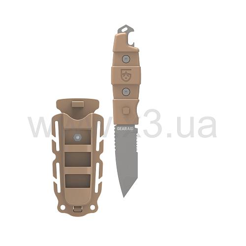 Дизайн ножа предусматривает клинок типа танто с частично серрейторной заточкой, небольшое отверстие под темляк и открывалку для бутылок. Ножны, которые можно размещать на брючном ремне, на горловине ботинок или на PALS-стропах, комплектуются универсальным и полностью съёмным металлическим креплением.
