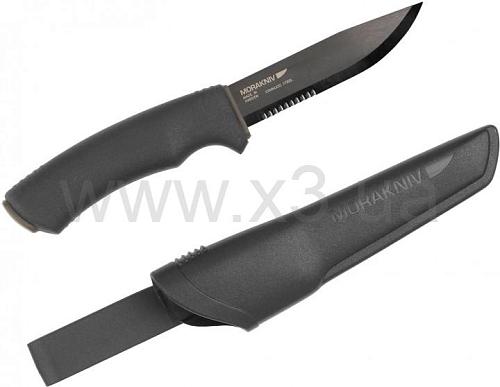 Нож MORA BushCraft Black SRT (12417) - это нож с полусеррейторным лезвием. Благодаря "зубчикам" нож гораздо лучше разрезает ткань, веревки и любые другие волокнистые материалы.